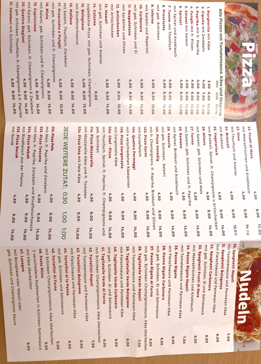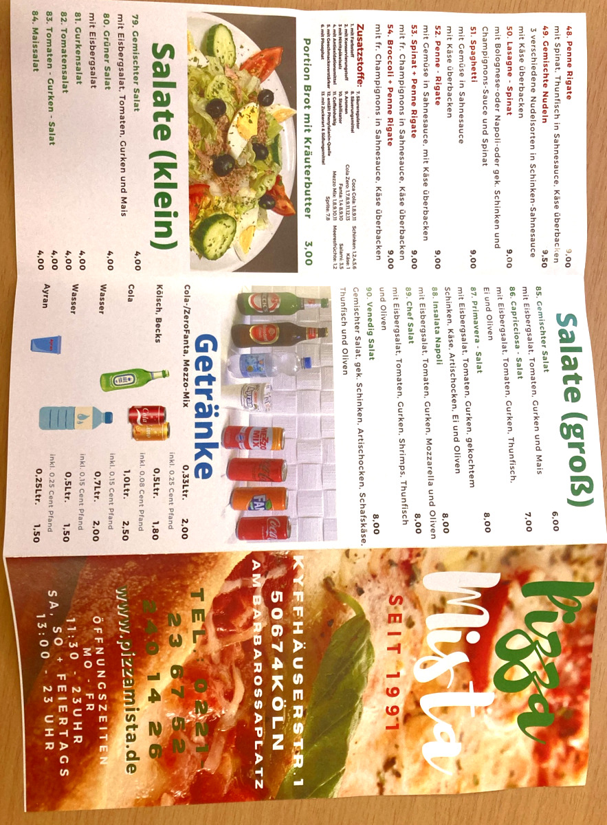Eine leckere Pizza ist manchmal eine Belohnung, manchmal ein Dankeschön, manchmal ein Trost, und immer köstlich PIZZA MISTA hat für SIE geöffnet einfach gutes Essen Traditionshaus seit 1991 Pizza Herrlich rund, praktisch dreieckig und einfach quadratisch zum Mitnehmen. Pasta Wer über den Tellerrand blickt, läuft Gefahr, seine Pasta aus den Augen zu verlieren. Salate Was so schön wächst, wird nicht verschmäht. Vorbeischauen Kyffhäuser Str.1 50674 Köln (am Barbarossaplatz) Vorbestellen & Abholen Telefon: 0221 23 67 52